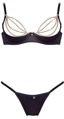 Dieses Set verspricht puren Luxus auf der Haut und akzentuiert die weiblichen Vorzüge gekonnt mit edlen Strassketten. Dabei ist der elastische Satinstoff aufregend zart und punktet auch bei den wildesten Spielchen mit einer perfekten Passform.