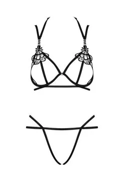 Mit verstellbaren Trägern und einem Verschluss auf der Rückseite. Die Cups sind offen. Dazu ein passender Ouvert-String.