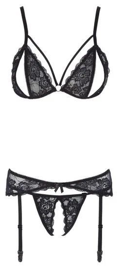 Dieses dreiteilige Strapsset verführt mit zarter Blütenspitze. Der BH mit verstellbaren Trägern besticht mit seinen Riemchendetails im Dekolleté und den aufregend geschlitzten Cups – akzentuiert mit einem dekorativen Zierring. Der dazugehörige Strapshalter ist schmal geschnitten und hat verstellbare Strumpfhalter. Beide Dessous-Teile werden mit einem praktischen Clipverschluss im Rücken geschlossen. Abgerundet wird das Ensemble von einem komplett offenen String.