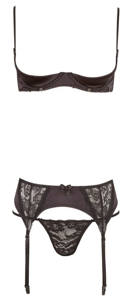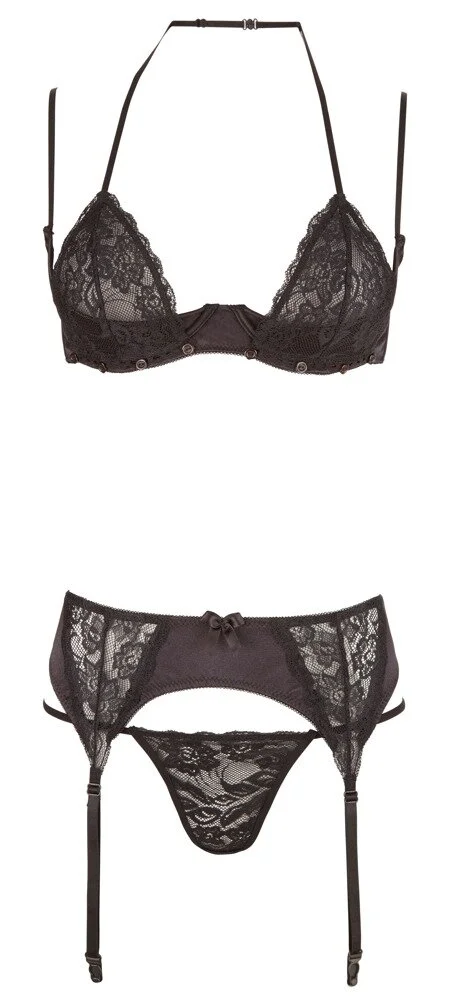 Dieses 3-teilige Straps-Set überrascht mit seinem raffiniertem BH: Knöpfen Dir einfach die Cups ab und schon hanrm Dir eine atemberaubend sinnliche Hebe. Mit passendem Strapsgurt und String für unvergesslich erotische Nächte. Zwei Strapshalter vorn und einer hinten (alle verstellbar) für optimalen Halt. Komplettiert wird das Set durch den beiliegenden String mit offenem Schritt. Dir Strümpfe sind nicht im Lieferumgang enthalten und sind optional erhältlich.