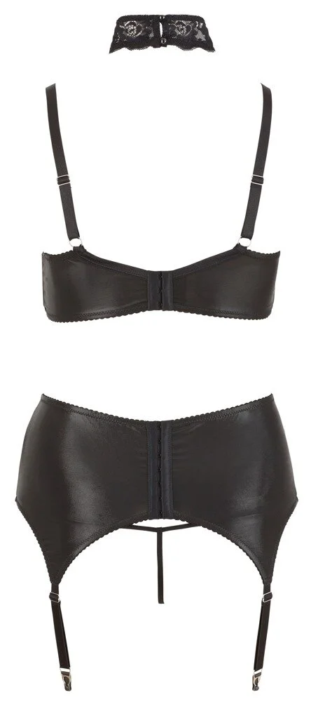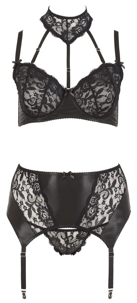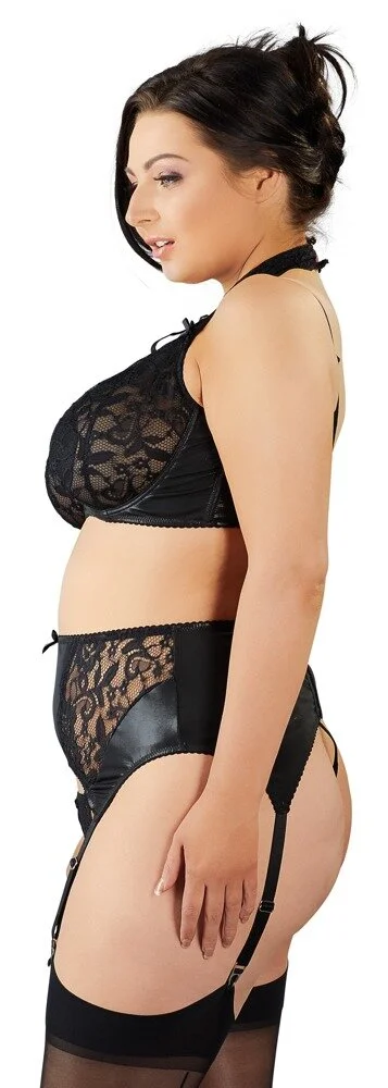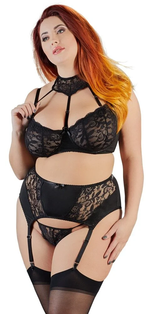 Das 3-teilige Straps-Set ist perfekt für Frauen mit üppigen Kurven! Die raffinierte Schnittführung mit extra breiten Trägern, der edle, elastische Material-Mix aus zarter Spitze und trendigem Glanzlook sowie die klassisch-erotische Farbe Schwarz setzen jede kurvige Silhouette perfekt in Szene.
