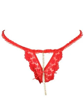 Roter Ouvert String (offen im Schritt) aus zarter Spitze und raffinierten Schnitt. Hochwertige Verarbeitung und wertvolle Glitzerstein Applikationen. 100 % Polyamide.