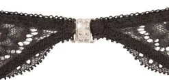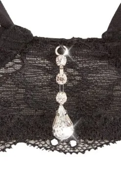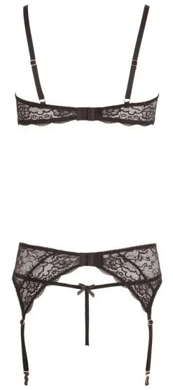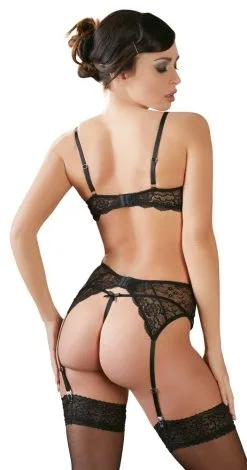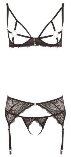 3-teiliges Straps-Set aus feiner schwarzer Spitze: Der Bügel-BH mit edlen Strass-Steinchen vorne verzaubert mit freigelegtem Busen, der lediglich von einem individuell anpassbaren Strass-Ring um die Nippel geschmückt wird. Während der Strapsgürtel mit funkelndem Strass-Öffner begeistert, lockt der String mit komplett offenem Schritt! BH und Strapsgürtel mit Hakenverschluss im Rücken. Träger, Strapshalter und Cup-Riemchen verstellbar. Abgebildete Nylons gehören nicht zum Lieferumfang.