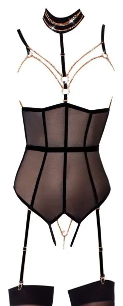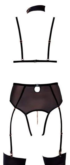 Busenfreier Body von Abierta Fina mit komplett offenem Schritt aus Powernet mit elastischen Samtstreifen und roségoldfarbenen Schmuckelementen. Träger und Strapse verstellbar, Strapse auch abnehmbar. Verstellbarer Dekolletésteg mit Ketten verziertem Halsband (mit Knopfverschluss) ebenfalls abnehmbar, genauso wie die mit kleinen Karabinern versehenen Brustketten und die mit dekorativem Ring versehene Schrittkette. Alle Ketten sind zusätzlich mit kleinen Strasssteinen verziert. Rückansicht in Zweiteiler-Optik mit zwei Clipverschlüssen an BH und Höschen/Strapsgurtbund.