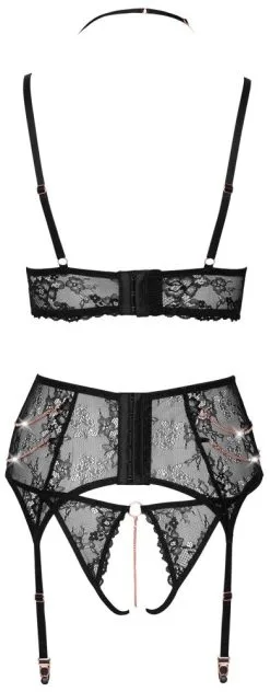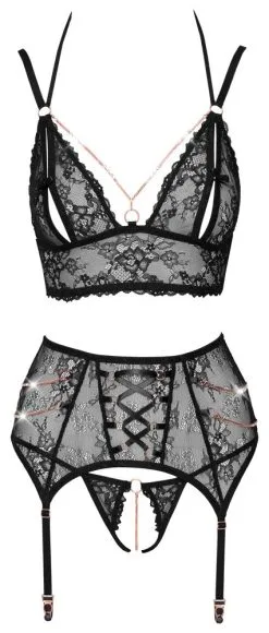 Bralette, Strapsgurt und Slip ouvert vereint im Set von Abierta Fina. Alles ist aus feiner elastischer Spitze gearbeitet und mit roségoldfarbenen Elementen, sowie mit Strass verzierten Kettchen geschmückt. Das Bralette mit seinen geschlitzten Cups erlaubt sinnliche Zugriffe. Der komplett schrittoffene Slip verführt mit einem stimulierenden Kettchen. Und der luftige Strapsgurt in Schnüroptik rundet das freizügige Ensemble elegant erotisch ab. Für optimale Passform sind Träger, Neckholder und Strumpfhalter verstellbar. Die Kettchen sind alle abnehmbar.