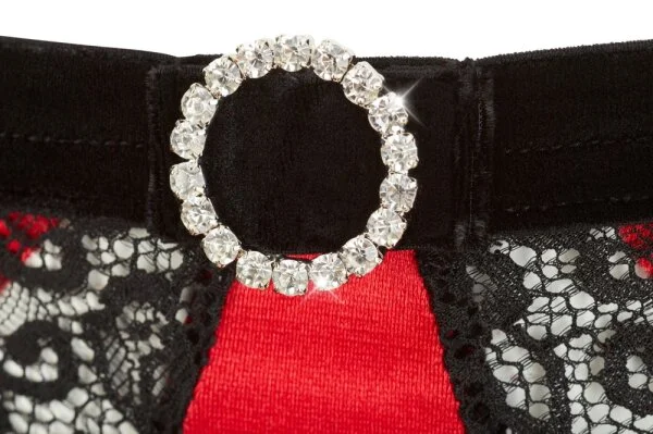 Dieses rote Satin-Bustier unterstreicht die weiblichen Vorzüge. Über den leicht gefütterten Cups umschließen aufwendige Riemchen-Details sinnlich den freien Busen. Der passende Taillenstring mit Strapsen ist komplett schrittoffen und wird an den Hüften nur durch elastische Bänder gehalten. Mit vielen liebevollen Details aus Samt, Blütenspitze und mit Strass – immer akzentuiert in der Kontrastfarbe Schwarz. Die Strümpfe sind nicht im Lieferumfang enthalten.