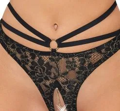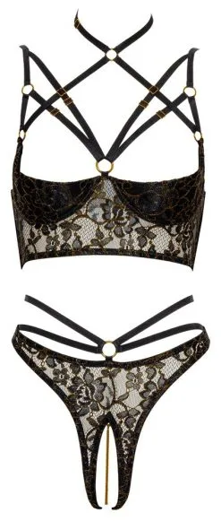 Longline-Hebe und Riostring ouvert im Set von Abierta Fina. Beide Teile in Schwarz mit goldfarbenen Details. Vorne aus Blütenspitze mit eingewebten Metallicfäden. Hinten aus elastischem Powernet. Die länger geschnittene Hebe mit leicht gepolsterten Bügel-Cups bringt den Busen in Hochform und direkt ins Blickfeld. Die sich kreuzenden Stretchriemchen im Dekolleté, der Neckholder und die Träger sind passend verstellbar. Der raffiniert mit Taillen-Stretchbändern designte Riostring verführt mit seinem offenen Schritt und einer stimulierenden Schrittkette, die auch abgenommen werden kann.