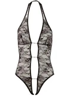 Neckholder-Body aus schwarzer Spitze mit silberfarbenen Glitzerfäden. Im