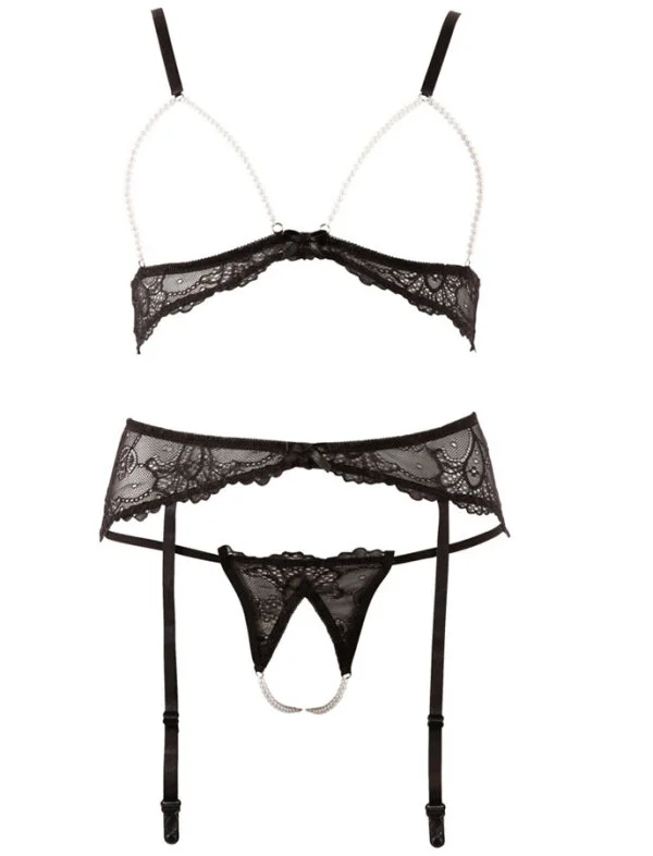3-teiliges Set bestehend aus Soft-BH, String-Ouvert und Strapsgürtel.
