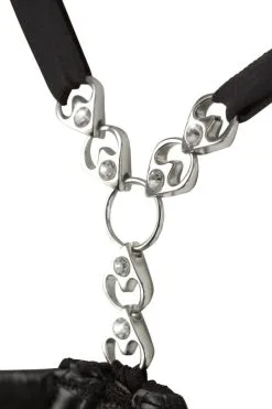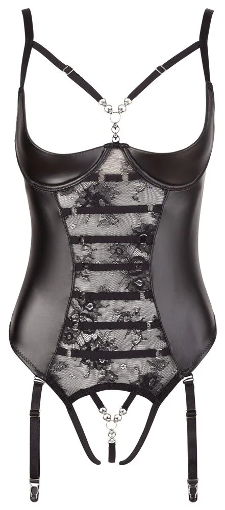 Der schwarze Stringbody mit Hebe und abnehmbaren Strapsen bringt die weiblichen Rundungen gekonnt zur Geltung. Zarte Riemchen-Details, akzentuiert mit edlen Strass-Elementen umrahmen sinnlich den Busen und den komplett offenen Schritt. Der semitransparente Spitzeneinsatz in der Front wird mit einer raffinierten Schnürung komplementiert.