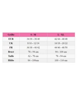 Diese Set besteht aus einem busenfreien BH, einem Taillegürtel und einem Ouvert-String. Die Bänder sind stufenlose verstellbar und sorgen für eine perfekte Passform. 80 % Polyamide, 20 % Elasthan.