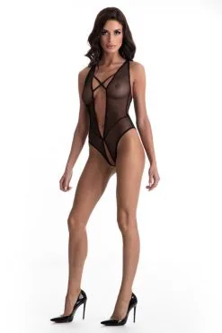 Transparenter Stringbody mit kreuzenden Bändern. Im Schritt offen. 90 % Polyamide, 10 % Elasthan.