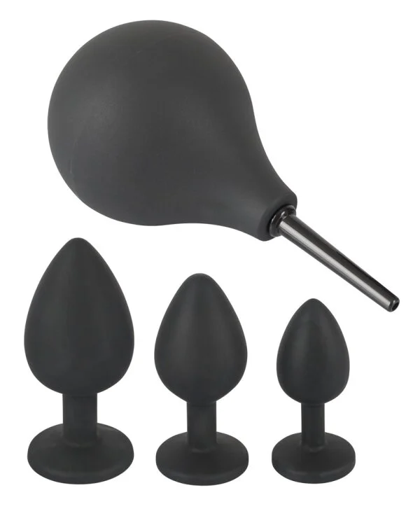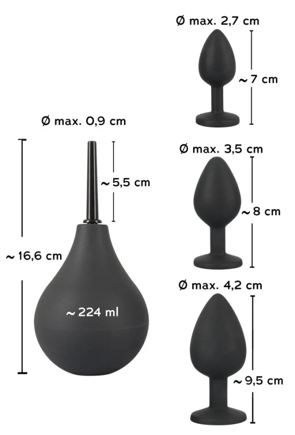 4 hochwertige Toys in einer Box: 1 x Analdusche für die vorbereitende Reinigung und herrliche Spritz-Feelings. 16,6 cm groß, Einführlänge 5,5 cm, Spritztüllen-Ø 0,7 bis 0,9 cm, Füllmenge 224 ml. 3 x Analplug in verschiedenen Größen für perfektes Dehn-Training und jeweils mit Schmuckstein an der Basis für eine aufregende Optik im Hinterstübchen. Maße: Plug Klein Gesamtlänge 7 cm, Einführlänge 6 cm, Ø max. 2,7 cm, 25 g schwer. Plug Mittel Gesamtlänge 8 cm, Einführlänge 7 cm, Ø max. 3,5 cm, 44 g schwer. Plug Groß Gesamtlänge 9,5 cm, Einführlänge 8,5 cm, Ø max. 4,2 cm, 75 g schwer.