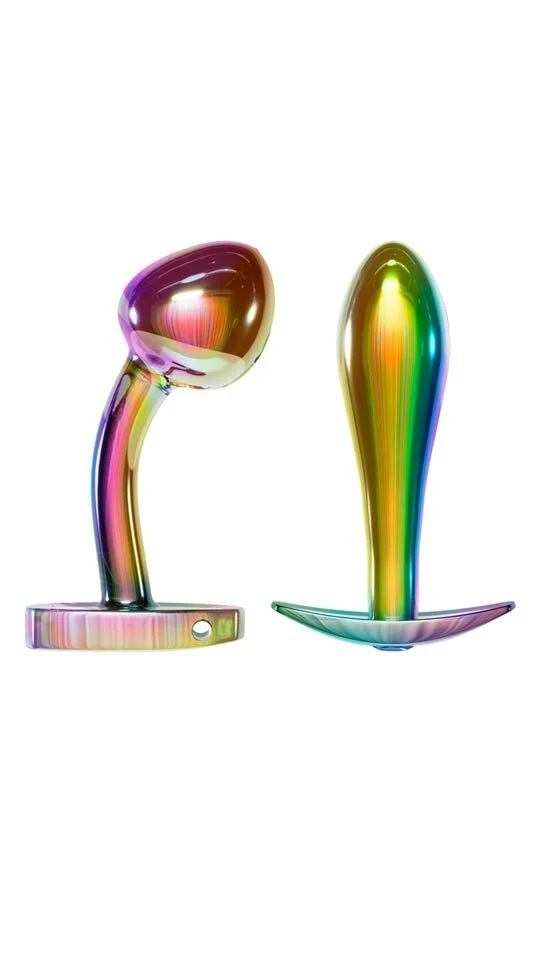 Metal Butt Plug Set in Rainbow Colours von ANOS mit 2 Analplugs aus Metall in edel schillernden Regenbogenfarben. Der eine klassisch konisch geformt, der andere leicht gebogen mit ausgeformter P-Punkt-Spitze.