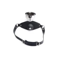 Maße: Anpassbar von 49 bis 68 cm im Umfang, Ballknebel hat 47 mm im Durchmesser, Aschenbecher ist 10 cm vom Gesicht entfernt, 7,5 cm im Außendurchmesser, 4,5 cm im Innendurchmesser und 4,5 cm in der Höhe.