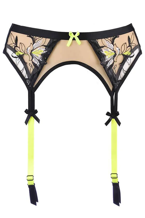 Verführerisch transparenter Strumpfhalter aus feinem Tüll filigraner Blütenstickerei. Mit kleiner Satinschleife an der Front. Die Halter sind stufenlos verstellbar. Hinten mit Häkchenverschluss. In der Farbkombination ein erotischer Hingucker. Das weiche Material liegt angenehmen auf der Haut