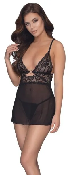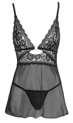 Kurzes Babydoll aus elastischem feinem Powernet mit Spitzen-Cups, die von einem goldfarbenem Ring zusammengehalten werden. Unterbrustband und Träger verbinden sich im Rücken ebenfalls mit einem goldfarbenen Ring. Träger verstellbar. Inklusive schlichter String aus Powernet.