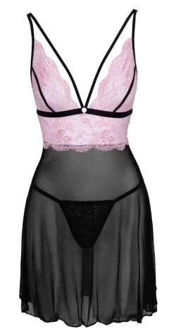 Kurzes, leicht ausgestelltes Babydoll aus elastischem feinem Powernet mit Spitzen-Oberteil. Das Unterbrustband aus glänzendem Gummi verbindet sich vorne und hinten durch Ringe mit den Doppel-Trägern, die verstellbar sind. Ein dazu passender kleiner Transparent-String ist inklusive.