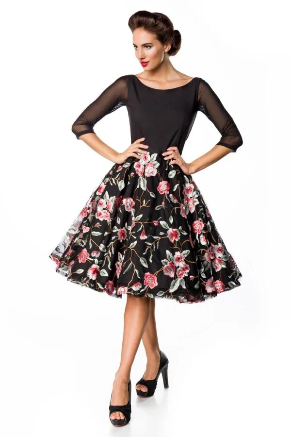 Elegantes Vintagekleid mit U-Boot Ausschnitt und Dreiviertelärmeln aus elastischem Netzstoff. Aufwendiger Meshrock mit aufgesticktem Blumenmuster