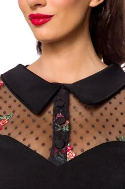Elegantes Vintage Kleid mit Umlegekragen, Dot-Polka und Blumen-Motiven im Mesh und weitgeschnittenen transparenten Ärmel mit Bündchen. Knopfleiste vorne.