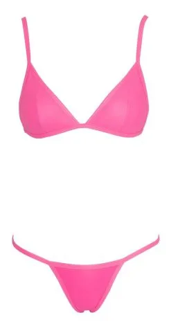 Bikini im auffällig neonpinkfarbenen Mattglanz. BH-Top mit abgenähten Cups und Clipverschluss im Rücken, Träger für perfekte Passform verstellbar. Klassischer Riostring mit schmalem Bund. Das weiche elastische Material sorgt für optimalen Sitz und hohen Tragekomfort beim Baden und Sonnen.