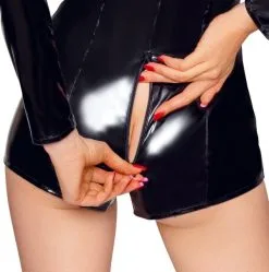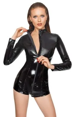 Langarm-Overall von Black Level komplett im schwarzen Lackglanz. In figurnaher Schnittführung mit kurzem Bein. Der Clou ist der praktisch-erotische 2-Wege-Reißverschluss, der vorne vom Stehkragen durch den Schritt bis über den Po verläuft und sich von beiden Seiten schnell öffnen lässt.