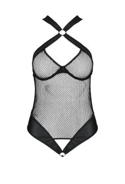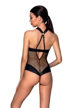 Eleganter Body gefertigt aus Netz und Kunstleder. Der Body wird überm Hals getragen. Mit eingearbeiteten Bügeln, verstellbaren Trägern und einem 2-fach verstellbaren Hakenverschluss auf der Rückseite.