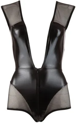 Ärmelloser Body aus einer Kombination von Wetlook und Netz in Schwarz. Mit Reißverschluss durch den Schritt..