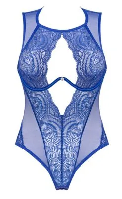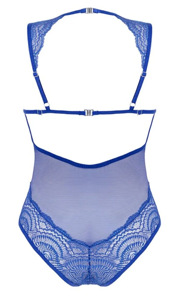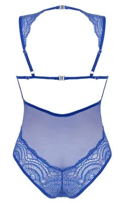 Charmanter Body Giselia von Obsessive aus feiner royalblauer Spitze im Mix mit zartem Powernet. Weich und elastisch für höchsten Tragekomfort. Die raffinierte Schnittführung mit tiefem Dekolleté und nahezu freiem Rücken schmeichelt der Silhouette, die hohen Beinausschnitte strecken optisch die Beine. Eingearbeitete Cupbügel und verstellbare Träger sorgen für perfekte Passform. Im Nacken und Rücken mit Clipverschluss, im Schritt mit Hakenverschluss.
