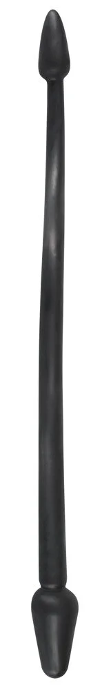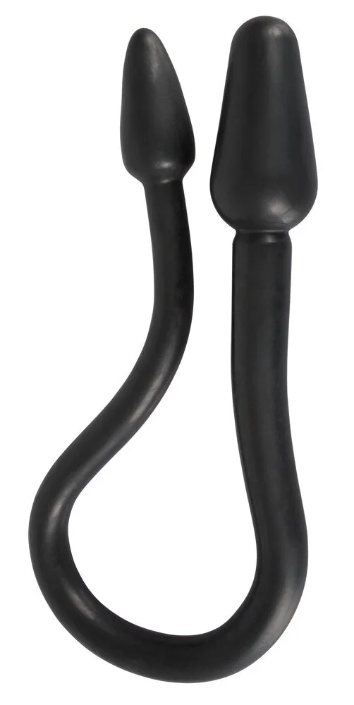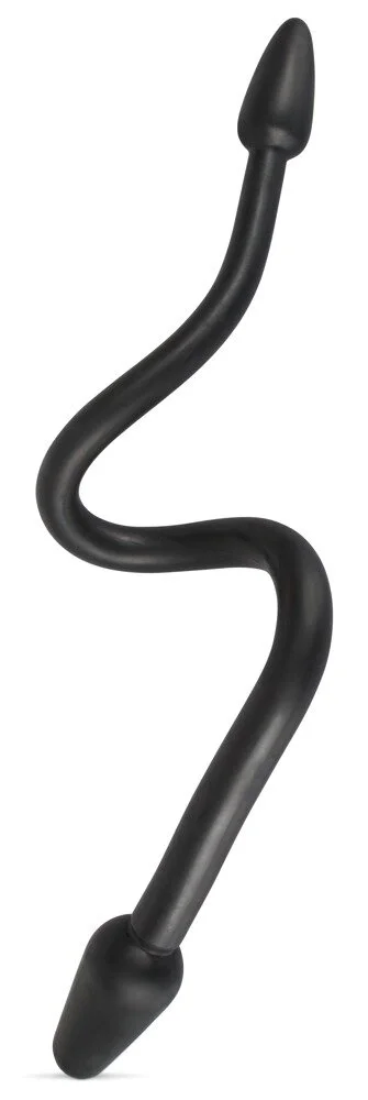 Biegsamer Doppeldildo mit Plug an jedem Ende. Für Solospiele vaginal und zugleich anal einführen, für Spiele zu zweit gönnt sich jede/r einen der Plugs. Schön gleitfreudige Oberfläche. Schwarz. Gesamtlänge 76,5 cm, Ø 2-5,1 cm. TPE