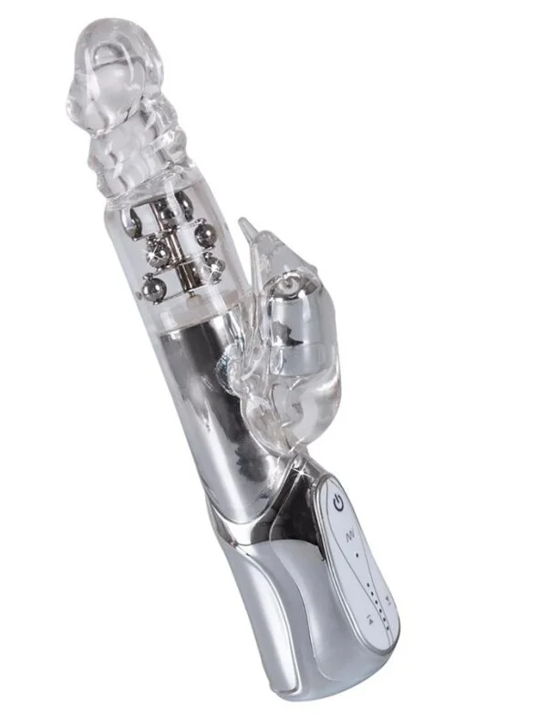 Lassen Sie sich von diesem Vibrator in einen noch nie erlebten Orgasmus-Rausch treiben – Sie wollen nie wieder etwas anderes! Die extra pralle Rotations-Eichel dreht und windet sich tief rein, während die sich drehenden Massage-Metallkugeln im Schaft die gesamte Vagina von oben bis unten orgasmuswirksam massieren. Für den vollendeten Orgasmus-Genuss sorgt der 7 cm lange Vibro-Biber, der Ihren Kitzler punktgenau mit wilden Vibrationen verwöhnt! Super-gleitfreudiges Transparent-Jelly-Material. Insgesamt 24,5 cm lang, Ø 4 cm. Funktionen getrennt steuerbar: Rotation in 6 Stufen von soft bis wild, Vibration in 7 Stufen von zart bis heftig pulsierend! (Bitte Batteríen extra bestellen: 4 x Mignon)