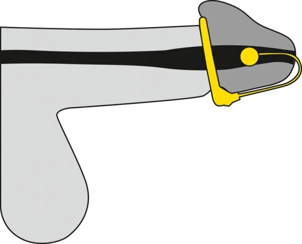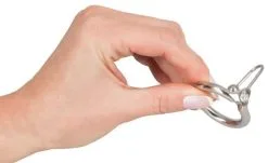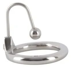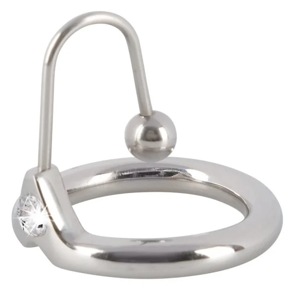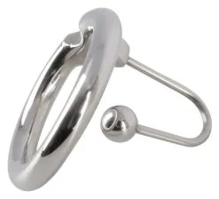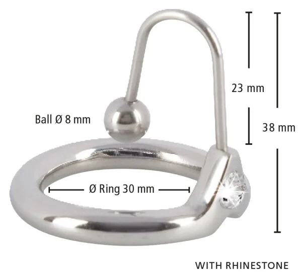 Bügel mit 8 mm großer Kugel an Eichelring. Kugel-Bügel wird in die Harnröhre eingeführt, Einführtiefe 2,3 cm. Ring-Ø 3 cm. Gewicht 29 g. Polierter, silberfarbener Edelstahl.