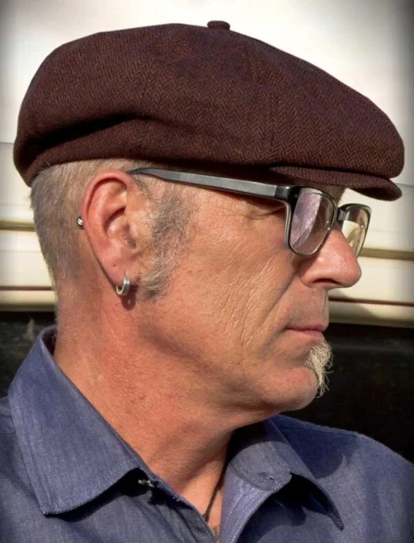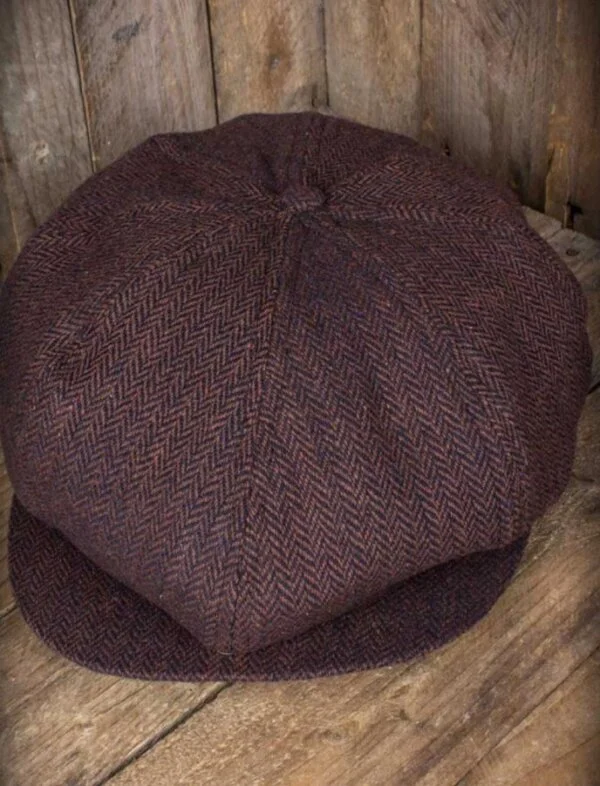 Diese Schiebermütze ist aus einem Woll-Mischgewebe im Fischgrat-Muster