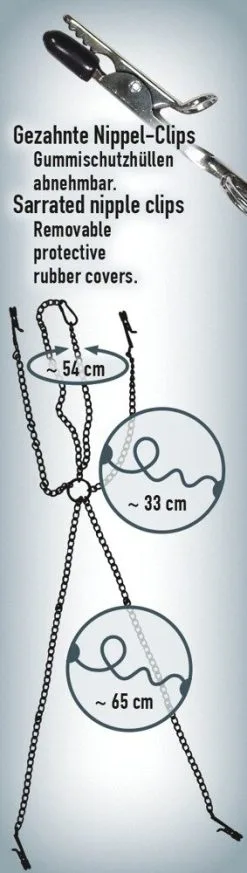 Robustes Geschirr aus silberfarbenem Metall (nickelfrei) für SIE und IHN! An dem Brustring (Ø 3,5 cm) sind Halskette, zwei Ketten mit Nippel-Klammern (Gesamtlänge jeweils 30 cm) und zwei Ketten mit Intim-Klammern (Gesamtlänge jeweils 66 cm) befestigt. Halskette mit Karabiner in der Länge verstellbar.