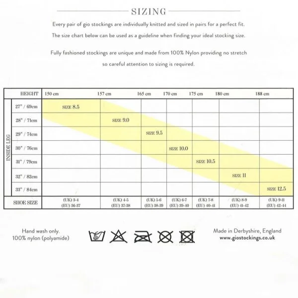 Echte Nahtnylons (Fully Fashioned) – hergestellt auf einer der letzten Flackstrickmaschinen der Welt. Genähte Naht und cubische Hochferse. 100 % Nylon
