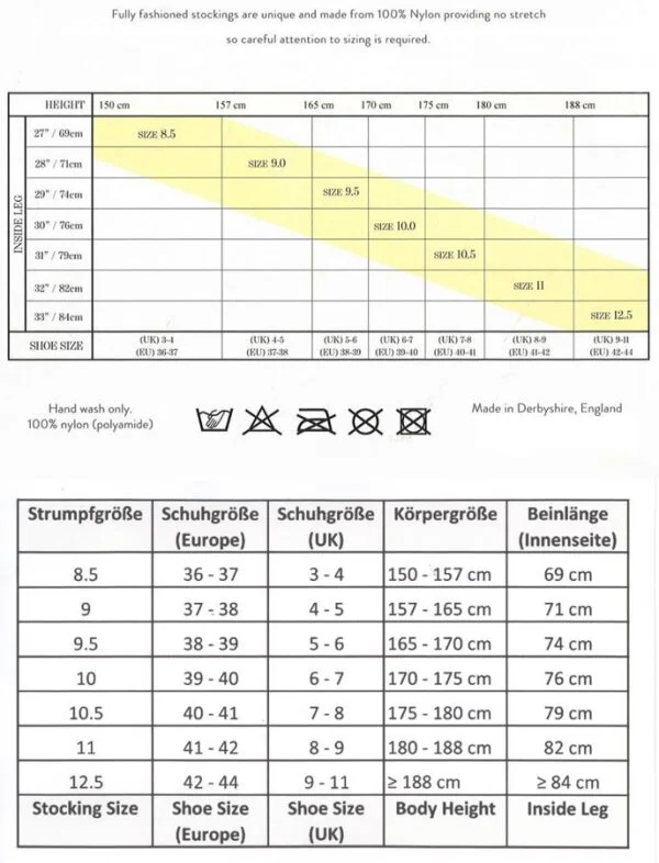 Echte Nahtnylons (Fully Fashioned) – hergestellt auf einer der letzten Flackstrickmaschinen der Welt. Genähte Naht und Havanna-Hochferse. 100 % Nylon