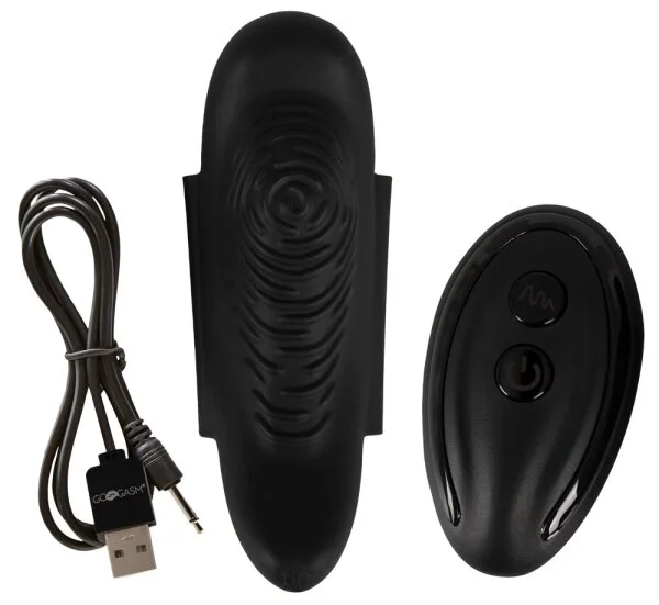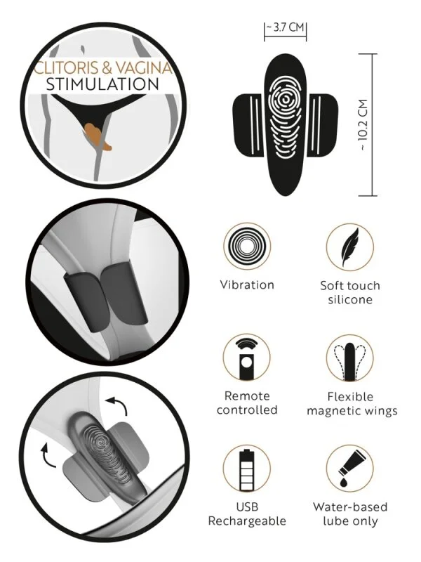 Ideal geformter, reizstrukturierter Panty Vibrator von GoGasm® mit Magnetflügeln zur rutschfesten Befestigung in jedem Slip. Stimuliert gezielt und intensiv Klitoris und Vulvalippen. 10 Vibrationsmodi sind mit der kabellosen Fernbedienung bequem per Knopfdruck steuerbar – auch vom Partner für Überraschungs- und Kontrollspiele. Die leisen, dennoch kraftvollen Vibrationen verwöhnen jederzeit und überall – völlig diskret, ohne dass jemand etwas bemerkt! Sogar im/unter Wasser, denn der leichte kleine Vibrator ist wasserdicht. Das hochwertige Silikonmaterial sorgt beim Tragen und Verwöhnen für ein sehr angenehmes Hautgefühl. Wiederaufladbar – inklusive USB-Ladekabel und Batterie (CR2032) für die Fernbedienung.