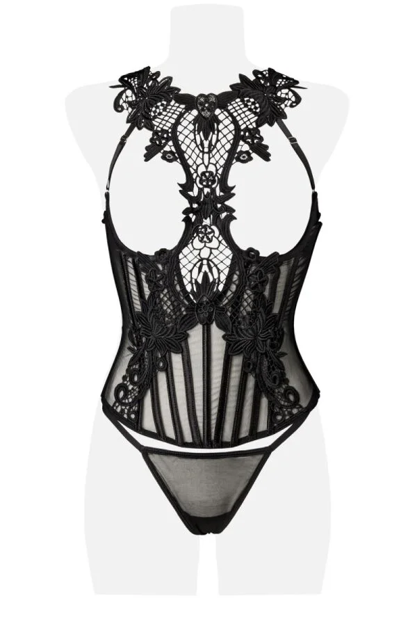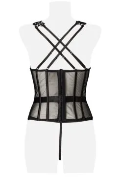 Unterbrustcorsage aus elastischem Mesh. Applikationen aus Häkelstpitze und mit Unterbrustbügeln und Formstäbchen.