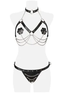 Das Set besteht aus einem Ouvert-BH mit Halsband, String und Pasties