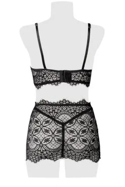 Das Set besteht aus einem Spitzen-Bustier, einen Minirock und einem passenden String.