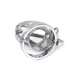 Dieser Keuschheitskäfig ist aus Metall gefertigt. Der Penis steckt in einem kurzen Penisrohr. Der A-Ring ist aufklappbar. Der Ring hat einen Durchmesser von 45 mm. Der Peniskorb hat einen Durchmesser von 32 mm. Der Käfig wird mit einem kleinen Vorhängeschloss verschlossen.