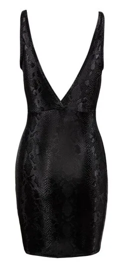 Trendiges kurzes Kleid in mattglänzend schillernder Schlangenhaut-Optik. Enge taillierte Schnittführung mit extra tiefem Ausschnitt vorne und hinten. Fantastisch elastisch für hautnahen Sitz und hohen Tragekomfort.