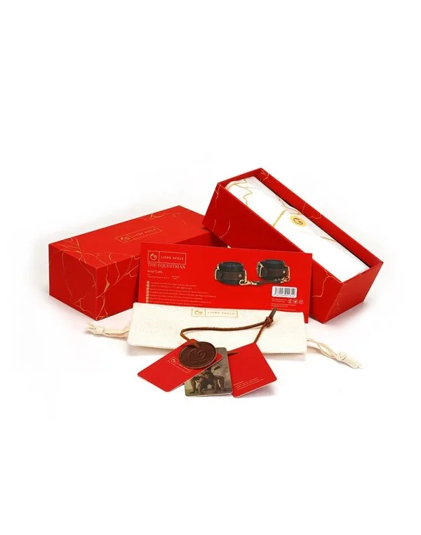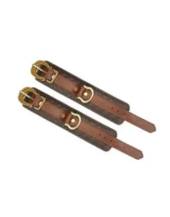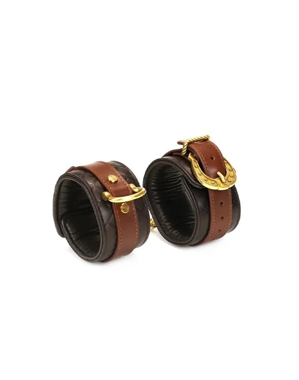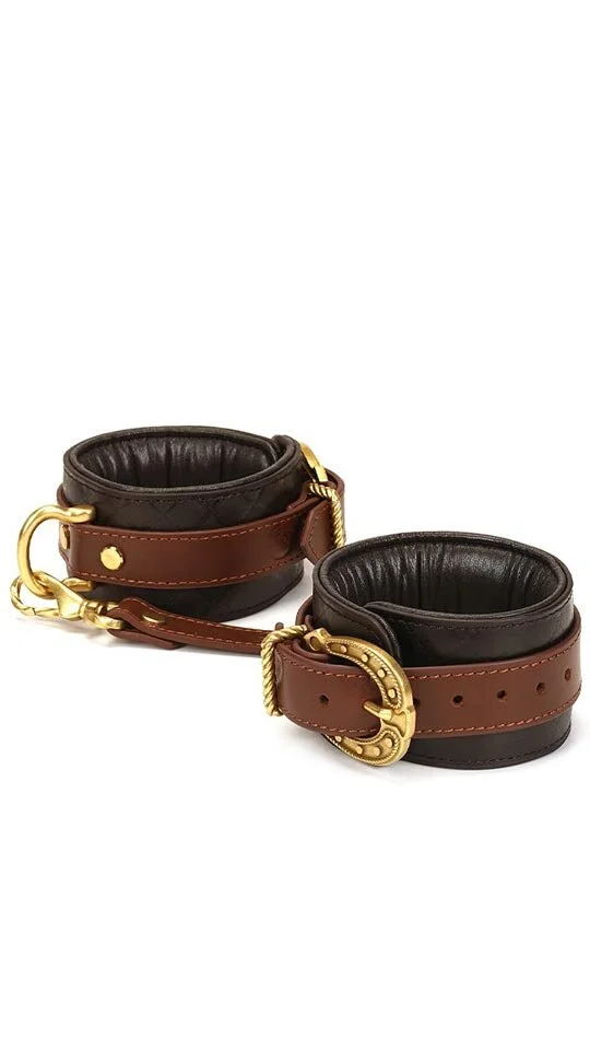 Die Armfesseln sind aus echtem Rindsleder in zwei Farben und Texturen handgefertigt, ein reich gepolstertes Inneres, das mit Lammleder gefüttert ist, um Komfort zu gewährleisten und mit den charakteristischen Hardware-Akzenten von The Equestrian in Nugget-Gold verziert ist. Die Armfesseln sind in einem Bereich zwischen 14 und 20,5 cm verstellbar.