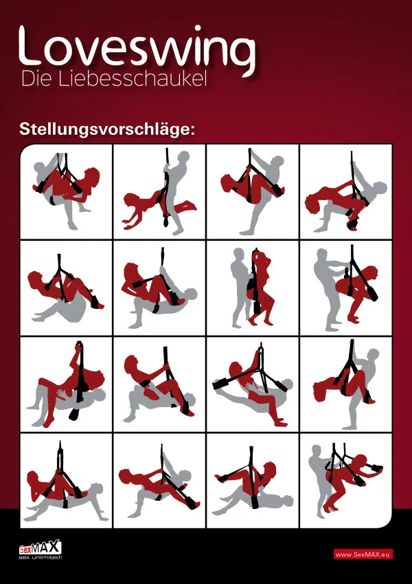 Genießen Sie die Liebe immer wieder neu – die unzähligen Stellungsvarianten, die mit der Liebesschaukel möglich sind, werden Sie begeistern! Liebesschaukel mit breiten, leicht verstellbaren Gurten. Komplett mit Spezialfeder. Belastbar bis 150 kg. Inklusive Gebrauchsanleitung sowie Stellungsvorschläge. Gurte: 100% Polyester, Polster: 100% Polypropylen, Schaumstoff: PE-Schaum, Stangenüberzug: 100% Baumwolle. Schieber: Metall, glanzvernickelt, Hakenband: 100% Polyamid, Halbring: Eisen, Karabiner: Metall, verzinkt, Kette und Zugfeder: Metall, galvanisch verzinkt. Unterlegscheibe: Stahl verzinkt, Mutter: Vollmetall.