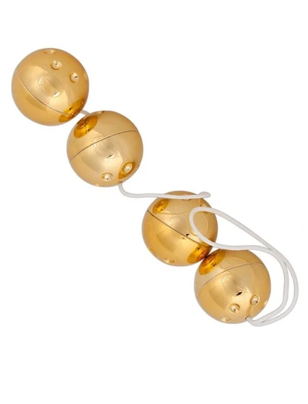 Einfach die Kugeln in Vagina und/oder Anus einführen. Bei jeder Körperbewegung rotieren im Kugel-Inneren kleine Vibro-Bälle: Ihr Unterleib tanzt Orgasmus-Samba! 4 Kugeln mit 24karätiger Goldauflage (Durchmesser: 3 cm), verbunden durch ein Band (ca. 30 cm lang).