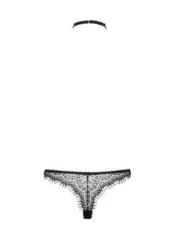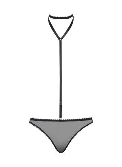 Ein edler Tanga mit Tüll an der Front und romantischer Spitze mit grafischen Details hinten. Der abnehmbare und verstellbare Harness wird mit Klammern am Nacken geschlossen und lässt den Rücken völlig frei.