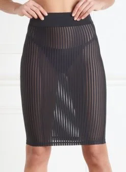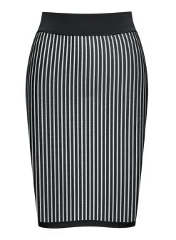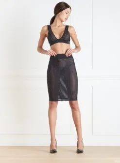 Diese Kollektion wurde durch den Kinofilm „Bande à part“ von Jean-Luc Godard inspiriert und zeichnet sich durch grafische Linien aus. Der Rock ist mit überraschenden vertikalen Streifen verziert, die ihm eine schöne Wirkung verleiht. Durch den engen Schnitt werden die Kurven elegant nachgezeichnet und das weiche Material erzeugt einen zweiten Hauteffekt.