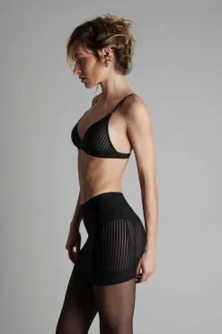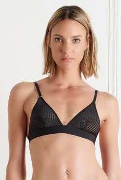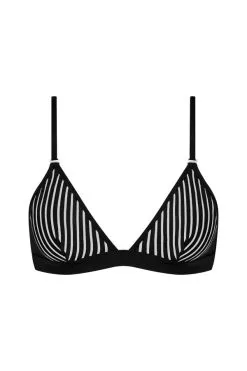 Diese Kollektion wurde durch den Kinofilm „Bande à part“ von Jean-Luc Godard inspiriert und zeichnet sich durch grafische Linien aus. Die dreieckigen Körbchen Des Triangel-BHs haben eine raffinierte Transparenz und bieten tiefe Einblicke in ein natürliches Dekolleté. Die Träger sind verstellbar.