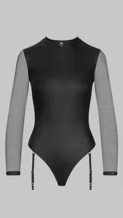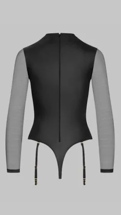 Hocherotischer Body aus sehr weicher Microfaser und Tüll von Maison Close®. Im Rücken mit einem Ton in Ton gehaltenen Reißverschluss zu öffnen. 4 verstellbare und abnehmbare Strumpfhalter mit goldfarbenen Accessoires. Eine gelungene Kreation aus Frankreich