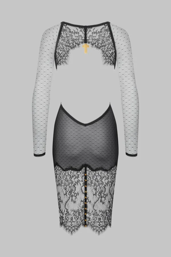 Langärmliges Kleid mit freien Rücken aus feiner Spitze und gepunkteten Schweizer Tüll. Eine Spitzenpasse am Rücken mit einem goldfarbenen Kreuz. Hinten mit goldfarbenen Knöpfen. Ein Futter aus gepunktetem Schweizer Tüll bedeckt Gesäß und Brust.. Ein Meisterstück von Maison Close® aus Frankreich.